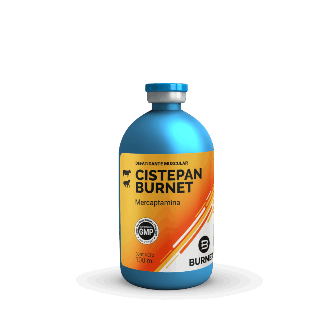 Ação: Cistepan Burnet facilita a derivação do ácido lático ao ciclo oxidativo diminuindo a fadiga muscular no equino atleta e a cetose no bovino, por reduzir o acúmulo de ácido lático.